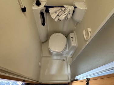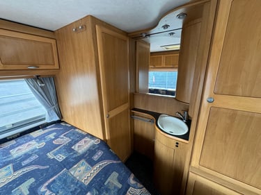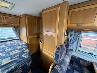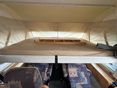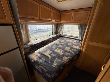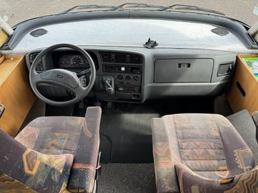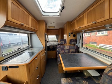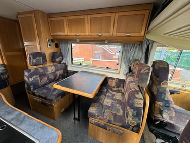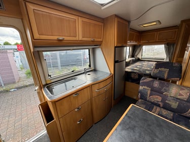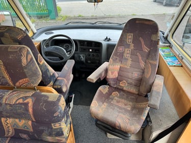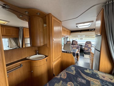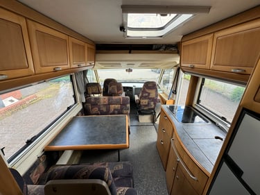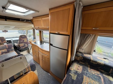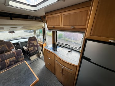 Cuisine équipée avec grand frigo, chauffage combi Truma, siège pivotant.